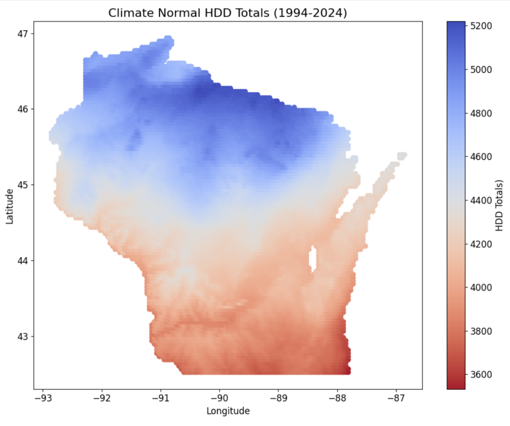Figure 2 illustrates the historic norm of HDDs in Wisconsin since 1994. On average, there are typically around 4,000 total HDDs between December and February. In other words, if you added up all the HDDs for all the days in those three months, that would be your approximate result. As expected, northern Wisconsin has more HDDs on average, indicating colder temperatures compared to the southern part of the state. As a comparison, Miami, Florida has about 100 HDDs on average.