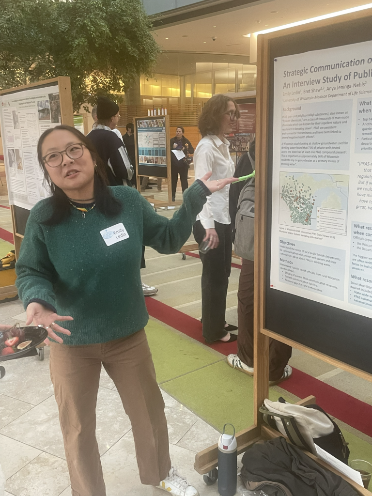 Undergraduates also gain experience through research partnerships across NRI. Emily Ledin, a UW–Madison Life Sciences Communication student, worked with Extension faculty and staff on her Senior Honors Thesis. Her research focused on a statewide needs assessment to understand how county and state health and conservation staff communicate about PFAS in drinking water, and the challenges they face in doing so.